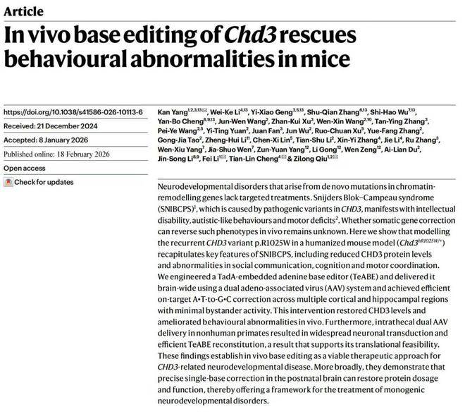 研究团队首先针对chd3-r1025w热点高频突变,构建了复刻患者核心症状的人源化突变小鼠模型,为治疗研究搭建精准的“疾病模拟平台”;并创新性设计新型腺嘌呤碱基编辑器teabe,这款“基因工匠”可精准识别并将突变的a・t碱基对修复为正常的g・c碱基对,与传统技术相比,全程无dna双链断裂风险,大幅降低基因组紊乱风险。经细胞水平多轮筛选,团队锁定了编辑效率最高、脱靶效应最低的sgrna与编辑器组合,通过尾静脉注射将其送入突变小鼠体内后,编辑器成功抵达小鼠多个脑区实现靶向修复,且旁观者效应极低。随着小鼠体内chd3蛋白水平显著恢复,其社交回避、认知迟钝、运动不协调等行为异常得到显著改善,在三箱社交、新物体识别、巴恩斯迷宫等实验中均恢复正常表现。